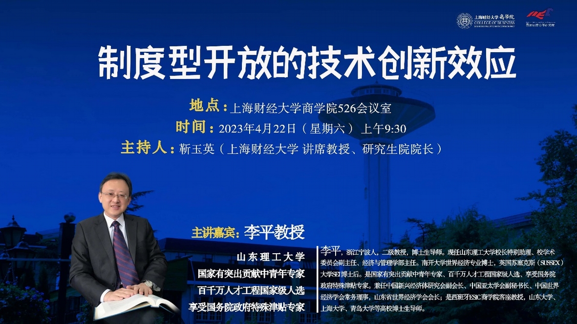 为推动我校世界经济学科建设,加强与国内外专家学者的合作交流,2023年4月22日上午,上海财经大学国际经济合作研究院邀请山东理工大学李平教授作题为“制度型开放的技术创新效应”的学术报告。我院执行院长靳玉英教授主持会议,对李平教授表示热烈欢迎与衷心感谢。来自我院的20余位师生参加了此次学术报告会。