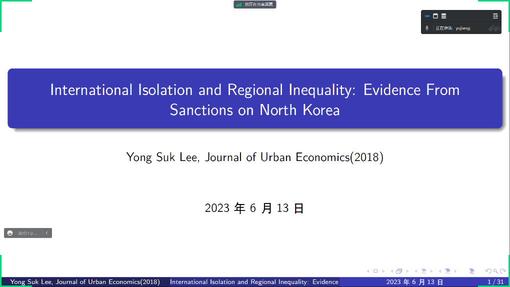 2021级世界经济专业博士生姜雨报告了Yong Suk Lee发表在Journal of Urban Economics上的“International isolation and regional inequality: Evidence from sanctions on North Korea”一文。美国、日本、韩国以及联合国等国家或组织利用经济制裁孤立朝鲜,使其无法从国际贸易和金融中获益。然而,中国并没有对朝鲜实施制裁,并且在朝鲜被制裁期间,中朝贸易额大幅增加,有效抵消了其他国家实施的贸易限制所带来的影响。在此背景下,本文主要研究当朝鲜与大多数国家隔离但同时又加深对中国的贸易依赖时,朝鲜内部的区域经济活动和地区间的不平等会发生何种变化。
