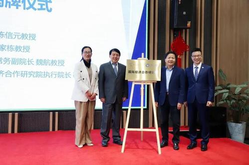上海财经大学副校长陈信元教授、南开大学经济学院佟家栋教授、上海财经大学商学院常务副院长魏航教授与“国际经济合作研究院”执行院长靳玉英教授共同为研究院揭牌并合影留念。