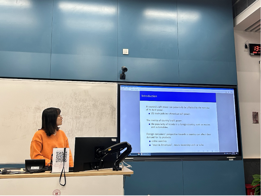 2023级世界经济专业硕博生陈虹玲报告了樊海潮等(2023)的一篇工作论文“The Trade War and American Soft Power: Evidence from Movies, Cars, Trust, and Online Searches”。该文旨在研究美国对华贸易战如何影响美国在华的文化软实力。文章采用区域差异性的特朗普关税风险敞口指标以评估贸易战的程度,并将美国电影在华的票房收入、美国品牌汽车在华的销量、国人对美国人的信任程度以及美国品牌的在线搜索量作为衡量美国软实力的指标。文章构造Bartik IV,并使用OLS模型进行实证分析。研究结果表明,在更易受到特朗普关税影响的地区,前述衡量文化软实力的指标都大幅下降,代表贸易战这一经济政策对美国在中国投射其软实力的能力带来了显著的负面影响。