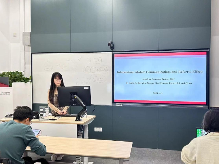 2022级世界经济专业博士生董文娟报告了Panle Jia Barwick,Yanyan Liu,Eleonora Patacchini和Qi Wu在2023年发表于American Economic Review的文章“Information, Mobile Communication, and Referral Effects”。该文利用中国北方某城市电信运营商的手机记录来考察信息交换在城市劳动力市场中的作用,首次证明了推荐人朋友会缓解求职过程中的信息摩擦,有利于求职者进行工作的转换,且这一过程表现在求职者与推荐人朋友之间的通话频率上升。文章还指出,这种推荐效应也会改善求职者和企业在劳动力市场中的表现。