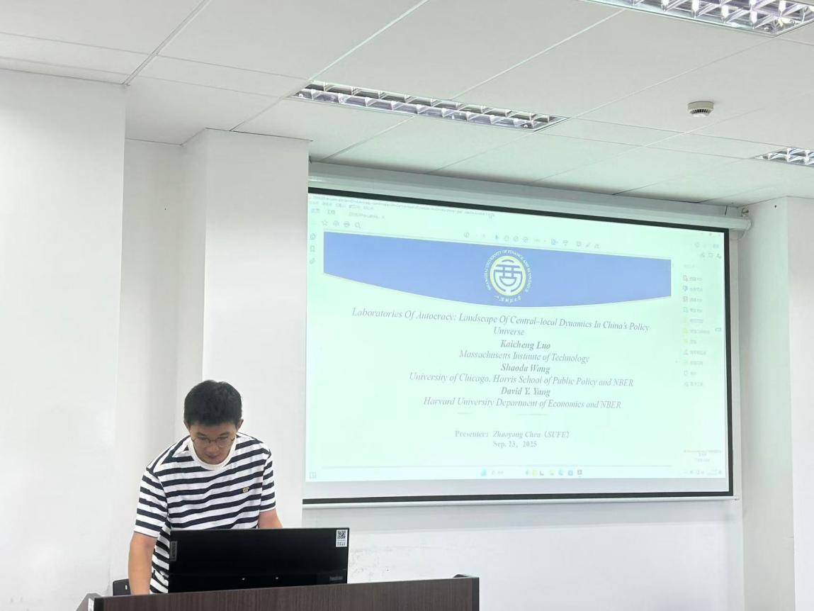 2023级国际贸易学专业博士生陈钊泳报告了2025年Kaicheng Luo,Shaoda Wang,David Y. Yang在NBER的“Laboratories of Autocracy: Landscape of Central–Local Dynamics in China’s Policy Universe”一文。基于370 万份中国政策文件及政府工作报告的综合数据库,该论文识别出 115,679 项独立政策,并系统追溯其发起与扩散过程。该文首次系统描绘了中国政策制定的去中心化与再中心化过程,并评估了政策创新、扩散、适配性与产出的影响。研究不仅揭示了地方官员在政策试验中的关键作用,为理解发展型国家治理模式的动态提供了新的证据。