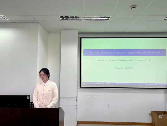 2025级国际贸易学专业博士生戴嘉宜报告了 Beata Javorcik, Benjamin Kett, Katherine Stapleton, Layla O'Kane在2025年发表于Journal of International Economics的文章“Did the 2018 trade war improve job opportunities for US workers?”。该论文利用Burning Glass Technologies (BGT) 提供的美国在线招聘广告数据库,创新性地从需求侧视角评估了2018年贸易战对美国劳动力市场的短期冲击。文章采用严谨的“转移-份额”(Shift-Share)策略,通过通勤区(Commuting Zones)层面的关税暴露度差异,精准识别并拆解了不同关税渠道对就业的净影响,为理解全球价值链背景下贸易保护主义政策的实际效果提供了新的微观证据。