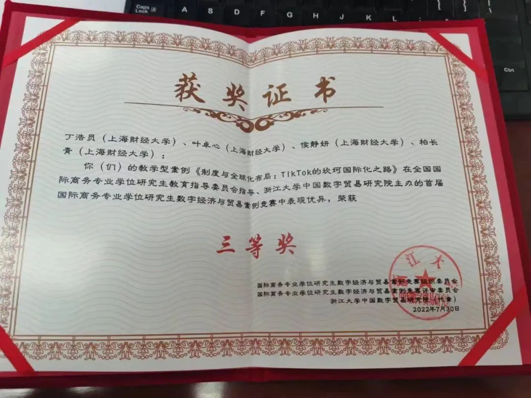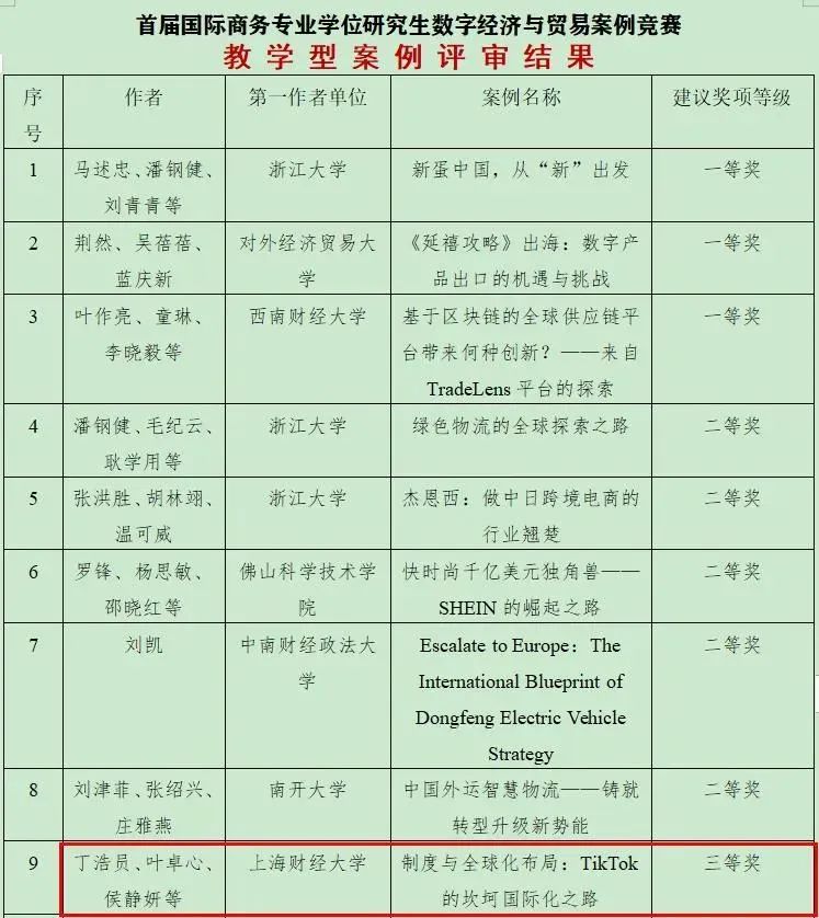 日前,由全国国际商务专业学位研究生教育指导委员会指导,浙江大学中国数字贸易研究院、浙江大学国际商务学科主办,杭州电子科技大学经济学院承办的“国际商务专业学位研究生案例工作会暨首届数字经济与贸易案例竞赛颁奖礼”举办。由我院丁浩员老师带队,叶卓心、侯静妍、柏长青三位同学组成团队参赛的教学型案例《制度与全球化布局:TikTok的坎坷国际化之路》荣获三等奖。该案例按照时间发展顺序,以“光明——黑暗——未来”三个阶段为叙述结构,回顾了海外版抖音TikTok的“出海”历程,并从制度环境切入,分析了制度对企业区位选择和进入策略的影响,同时分析了对TikTok国际化战略产生影响的正式制度因素和非正式制度因素,以期为国内其他互联网企业的国际化战略提供建议与思路。本次案例竞赛旨在深入贯彻落实《专业学位研究生教育发展方案(2020-2025)》,完善国际商务专业学位研究生教育评价机制,强化专业学位论文应用导向,增强数字经济与贸易主题案例教学应用与研究写作能力,提升国际商务专业学位研究生培养质量。自2022年4月14日赛事正式启动以来,共吸引了浙江大学、南开大学、对外经济贸易大学、上海财经大学、西南财经大学、中南财经政法大学等50多所高校参赛,参赛作品总132件,其中教学型案例60篇、研究型案例72篇。在全国国际商务专业学位研究生教育指导委员会指导下,分别组织教学型案例和研究型案例评审,产生教学型案例、研究型案例一等奖各3篇、二等奖各5篇、三等奖各10篇,优秀奖各若干。上海财经大学是全国首批国际商务硕士专业学位(MIB)授权单位。上海财经大学国际商务硕士立足于数智时代培养具有全球视野的高级国际商务人才,通过全流程质量保障体系,形成了高质量、国际化的鲜明人才培养特色,人才培养效果显著。项目开办至今,累计培养了千余名优秀毕业生,为跨国公司、总部机构、国际组织等培养了大量的人才,从事跨国公司管理、投融资服务、国际贸易业务等工作,为我国深度参与、引领全球经贸治理提供人力支持。商学院2021级国际商务专硕 叶卓心:参与撰写TikTok案例为我提供了一次系统性参与完整案例写作的宝贵经验。这和之前参与案例分析比赛或上管理学等课程时对企业商业行为进行分析并提出建议不同,这次,我们的角色变成了案例撰写者而不是案例分析者。角色的转换并不容易,写作过程中我们遇到了不少难题,丁老师和我们仨用汗水种下了这株小树,丁老师耐心、认真地指导我们确定案例的“树干”,不厌其烦,只求案例内容更加具有侧重点和贴合教学知识点,静妍、长青与我对案例“枝节”部分进行了反复的修剪与更新,最后的成文部分和案例使用说明部分均经历了多版内容和数据更新,因此最后获奖对我们而言既是一份惊喜的礼物,又是对我们努力的肯定,这将激励着我们继续探索广袤的案例森林!